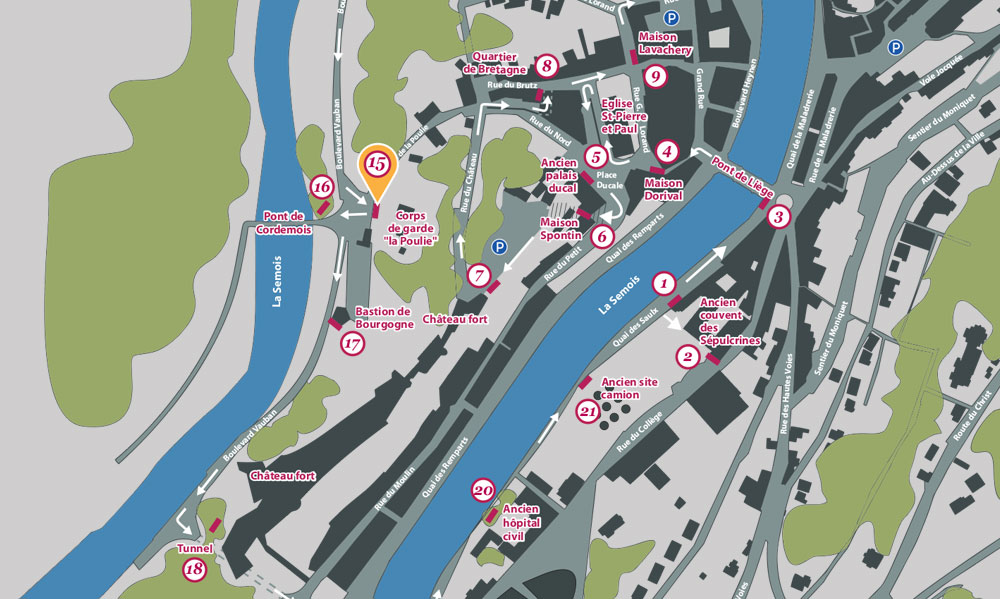 Dieses Gebäude stammt aus dem Ende des 17.Jahrhunderts und ist mit einigen anderen Verstärkungen aus der Zeit von Vauban (1633-1707) erhalten geblieben. Außer den Wachttürmen, die die Ecken der Stadtmauer umrahmten, hatte der berühmte, Militäir-Architekt auf diesem Platz eine Pforte mit einer Nische unter dem Namen « La Poulie » vorgesehen. Dieser Durchgang ließ Leute, die stromabwärts kamen, via eine Furt die Semois durchwaten, und so die Stadt erreichen. Es gab auch die Möglichkeit die gestallten Pferde in der Semois trinken zu lassen.Anfang des 20.Jahrhunderts, als man die Semois noch mit einem Boot übersetzte, war es die Wohnung des Fährmannes und seiner Familie. Später in den Jahren nach 1950 wohnte hier der Pförtner des Schlachthofs, der in der Bastion de Bourgogne untergebracht war. Nun wartet das Gebäude um als Denkmal erkannt und mit Zuschüssen renoviert